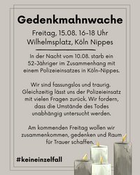 33. Gedenkmahnwache für ?. Tod eines 52-jährigen Mannes bei einem Polizeieinsatz in Köln
