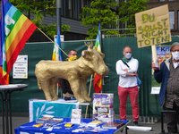 Etwa 100 Personen demonstrierten zu Beginn der virtuellen Hauptversammlung von Rheinmetall (RHM) am 19. Mai vor der Düsseldorfer Konzernzentrale. Die Kampagne „Aufschrei – Stoppt den Waffenhandel!“,…