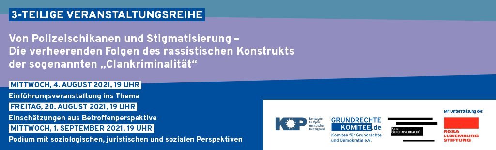 Diese Veranstaltungsreihe ist eine Kooperation der Kampagne für Opfer rassistischer Polizeigewalt (KOP), des Komitees für Grundrechte und Demokratie e.V. und der Initiative „Kein Generalverdacht“. Unterstützt wird die Veranstaltungsreihe von der Rosa Luxemburg Stiftung.